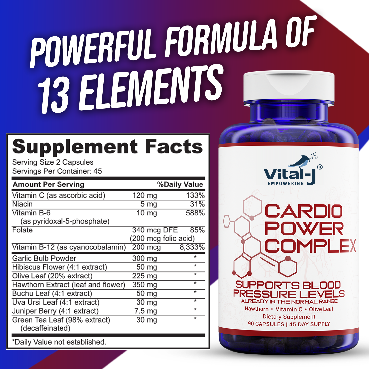Vital-J Empowering Cardio Power Complex – Premium Blood Pressure Support Supplement with Garlic, Hawthorn, Hibiscus, Olive Leaf – 13 Natural Ingredients – 90 Capsules